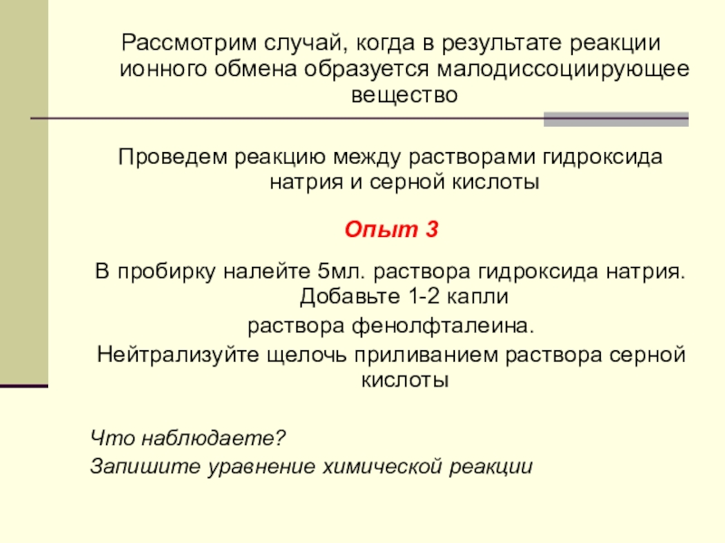 Рассмотрим случай, когда в результате реакции ионного обмена образуется малодиссоциирующее веществоПроведем реакцию между растворами гидроксида натрия и