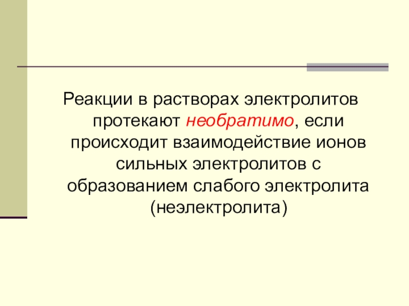 Реакции в растворах электролитов протекают необратимо, если происходит взаимодействие ионов сильных электролитов с образованием слабого электролита (неэлектролита)