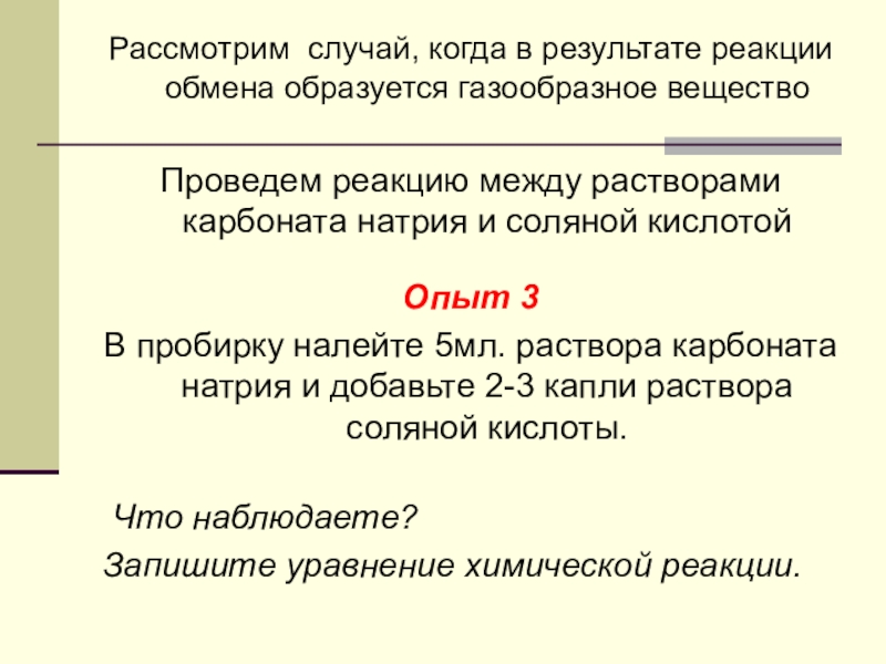 Слайд 7Рассмотрим случай, когда в результате реакции обмена образуется газообразное вещество