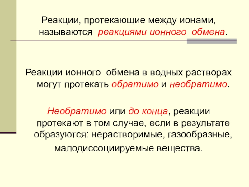 Реакции, протекающие между ионами, называются реакциями ионного обмена.Реакции ионного обмена в водных растворах могут протекать обратимо и необратимо.Необратимо или до конца, реакции протекают в том случае, если в результате образуются: нерастворимые, газообразные, малодиссоциируемые вещества.