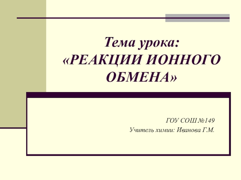Тема урока:  «РЕАКЦИИ ИОННОГО ОБМЕНА»ГОУ СОШ №149Учитель химии: Иванова Г.М.