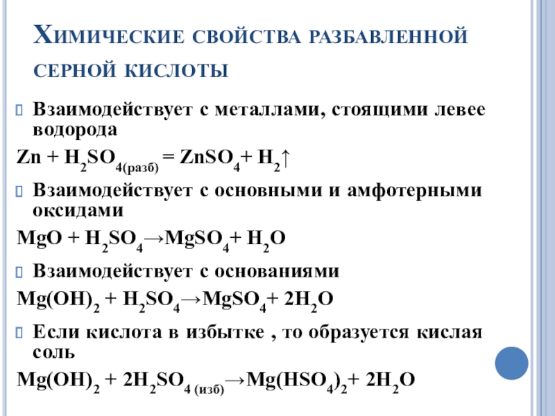 Химические свойства разбавленной серной кислотыВзаимодействует с металлами, стоящими левее водородаZn + H2SO4(разб) = ZnSO4+ H2↑Взаимодействует с основными