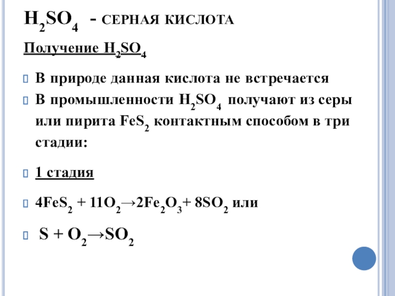 H2SO4 - серная кислота Получение H2SO4В природе данная кислота не встречаетсяВ промышленности H2SO4 получают из серы или пирита FeS2 контактным способом в три стадии: 1 стадия4FeS2 + 11O2→2Fe2O3+ 8SO2 или S + O2→SO2