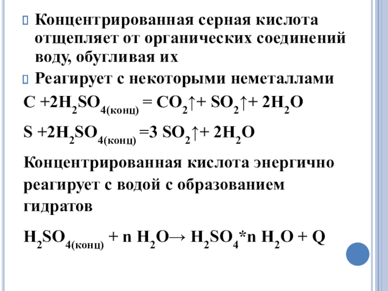 H2SO4(конц) + n H2O→ H2SO4*n H2O + Q