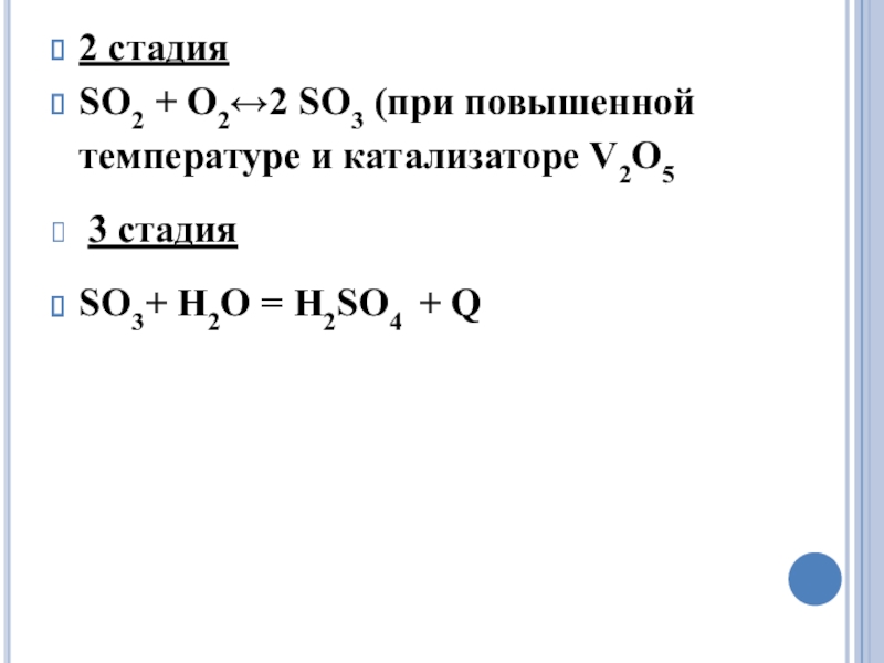 2 стадияSO2 + O2↔2 SO3 (при повышенной температуре и катализаторе V2O5 3 стадияSO3+ H2O = H2SO4 +