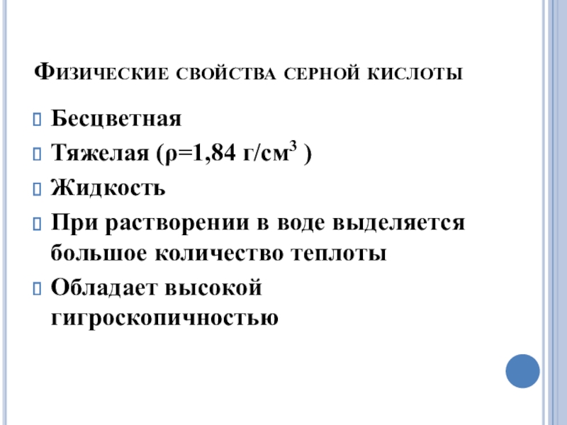 Физические свойства серной кислотыБесцветнаяТяжелая (ρ=1,84 г/см3 )ЖидкостьПри растворении в воде выделяется большое количество теплотыОбладает высокой гигроскопичностью