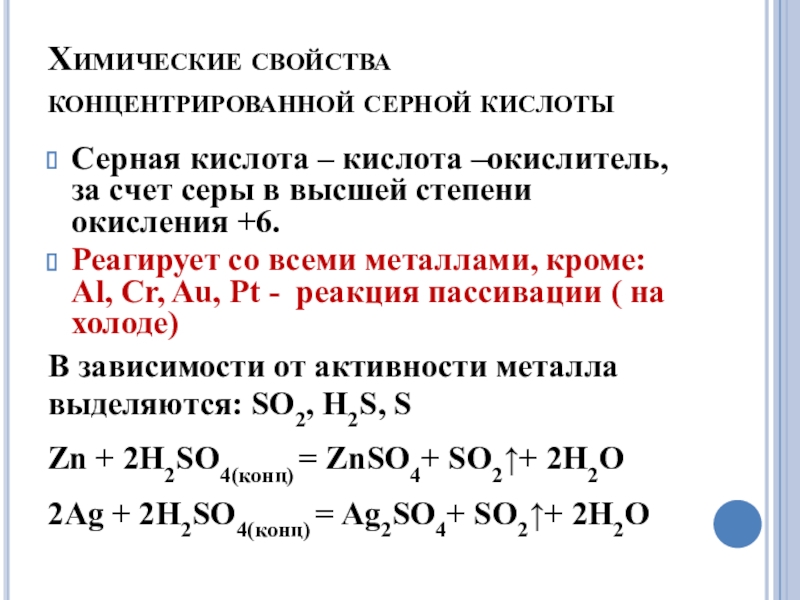 Химические свойства концентрированной серной кислотыСерная кислота – кислота –окислитель, за счет серы в высшей степени окисления +6.Реагирует