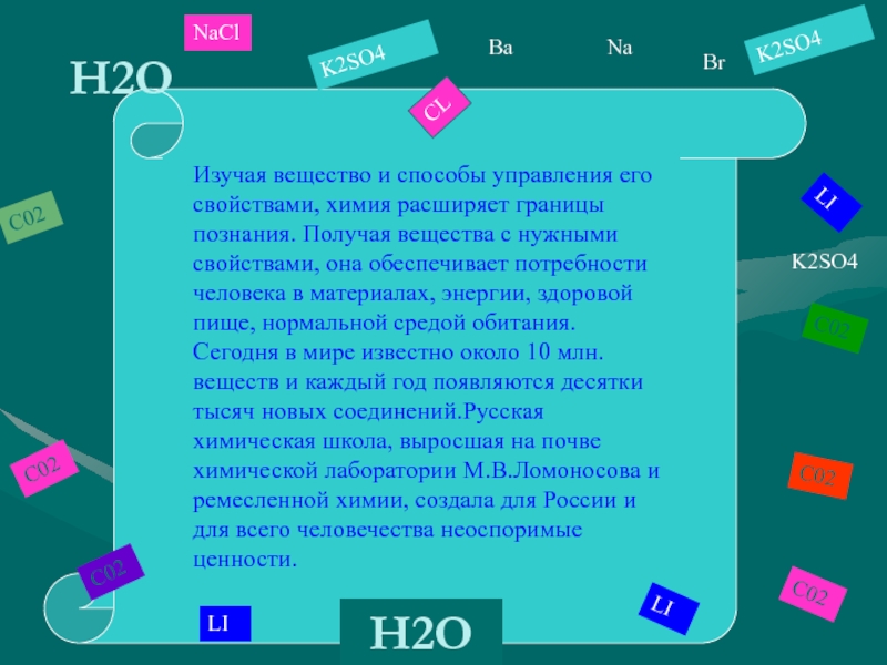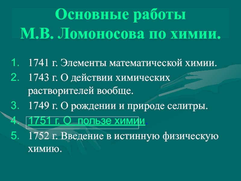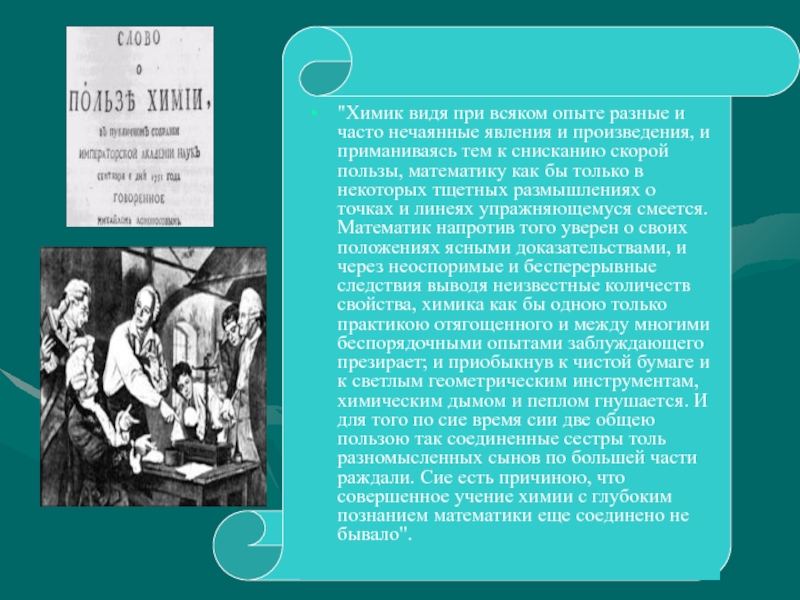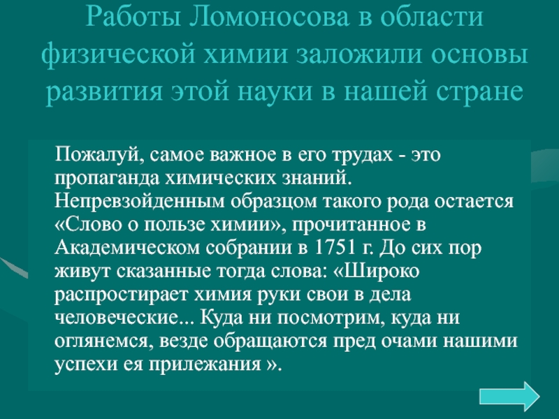 Пожалуй, самое важное в его трудах - это пропаганда химических знаний. Непревзойденным образцом такого рода остается «Слово о пользе химии», прочитанное в Академическом собрании в 1751 г. До сих пор живут сказанные тогда слова: «Широко распростирает химия руки свои в дела человеческие... Куда ни посмотрим, куда ни оглянемся, везде обращаются пред очами нашими успехи ея прилежания ».