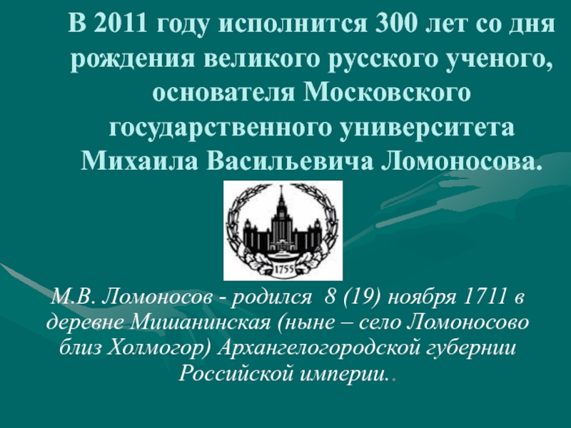 М.В. Ломоносов - родился 8 (19) ноября 1711 в деревне Мишанинская (ныне – село Ломоносово близ Холмогор) Архангелогородской губернии Российской империи..