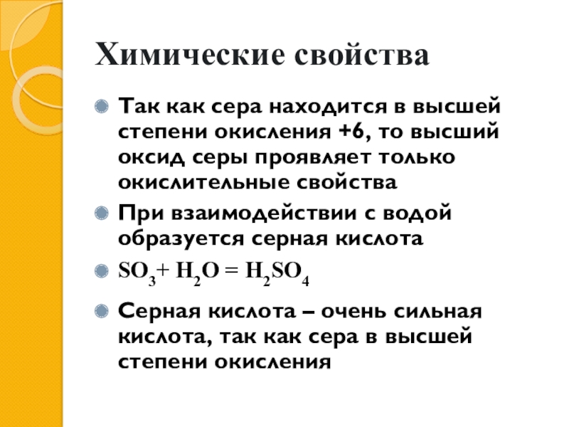 Химические свойстваТак как сера находится в высшей степени окисления +6, то высший оксид серы проявляет только окислительные