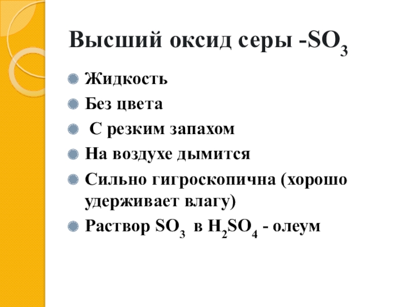 Высший оксид серы -SO3ЖидкостьБез цвета С резким запахомНа воздухе дымитсяСильно гигроскопична (хорошо удерживает влагу)Раствор SO3 в H2SO4