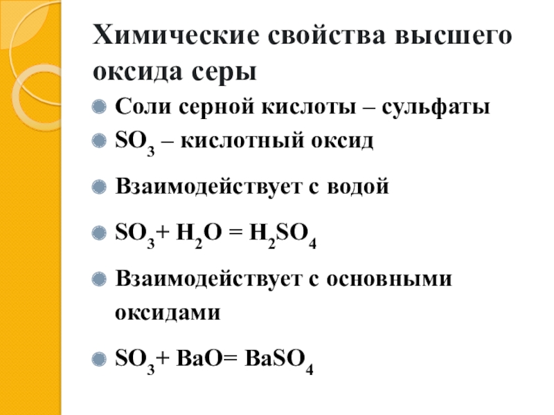 Химические свойства высшего оксида серыСоли серной кислоты – сульфатыSO3 – кислотный оксидВзаимодействует с водойSO3+ H2O = H2SO4Взаимодействует