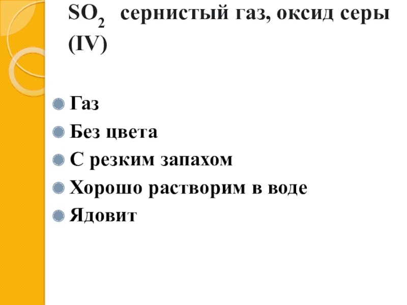 SO2  сернистый газ, оксид серы (IV) ГазБез цветаС резким запахомХорошо растворим в водеЯдовит