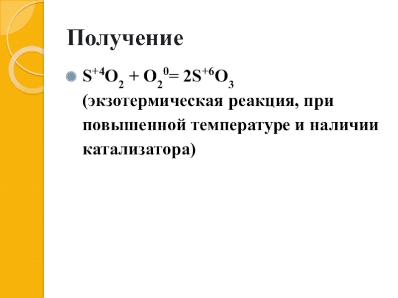 ПолучениеS+4O2 + O20= 2S+6O3  (экзотермическая реакция, при повышенной температуре и наличии катализатора)