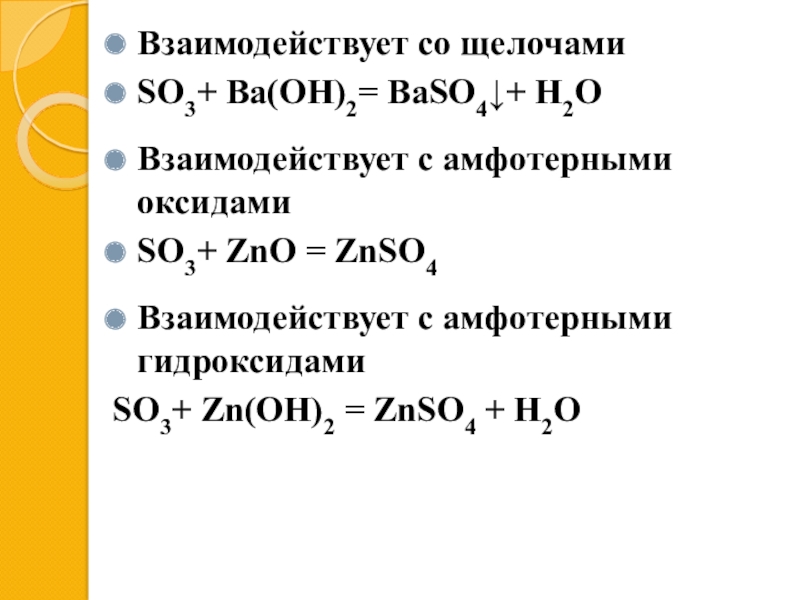 Взаимодействует со щелочамиSO3+ Ba(OH)2= BaSO4↓+ H2OВзаимодействует с амфотерными оксидамиSO3+ ZnO = ZnSO4 Взаимодействует с амфотерными гидроксидамиSO3+ Zn(OH)2