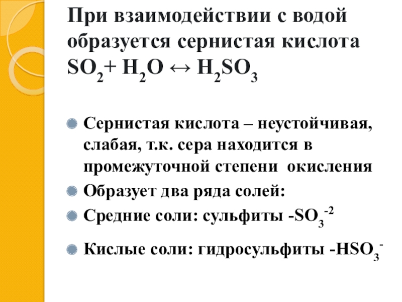 При взаимодействии с водой образуется сернистая кислота SO2+ H2O ↔ H2SO3 Сернистая кислота – неустойчивая, слабая, т.к.