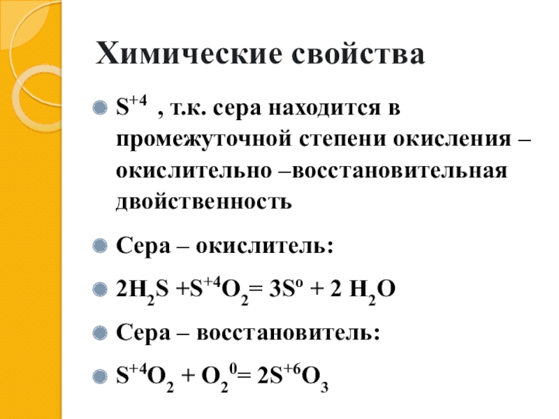 Химические свойстваS+4 , т.к. сера находится в промежуточной степени окисления – окислительно –восстановительная двойственностьСера – окислитель:2H2S +S+4O2=