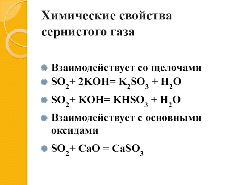 Химические свойства сернистого газаВзаимодействует со щелочамиSO2+ 2KOH= K2SO3 + H2OSO2+ KOH= KHSO3 + H2OВзаимодействует с основными оксидамиSO2+