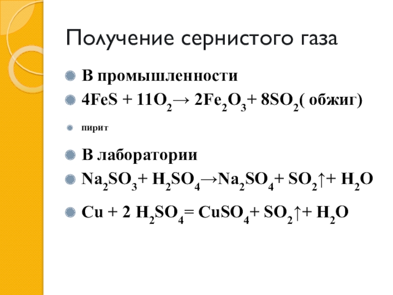 Получение сернистого газаВ промышленности4FeS + 11O2→ 2Fe2O3+ 8SO2( обжиг)пиритВ лабораторииNa2SO3+ H2SO4→Na2SO4+ SO2↑+ H2OCu + 2 H2SO4= CuSO4+