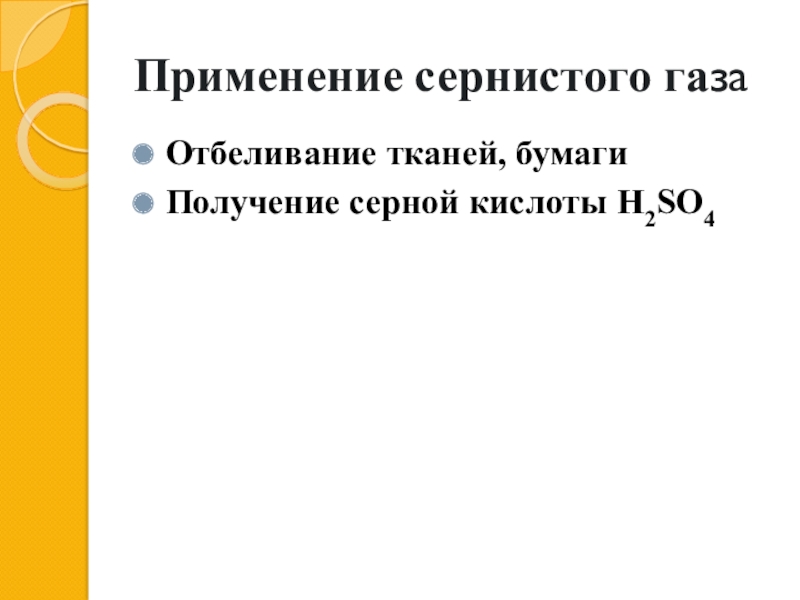 Применение сернистого газаОтбеливание тканей, бумагиПолучение серной кислоты H2SO4