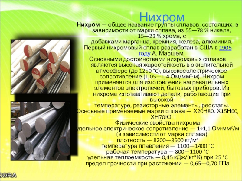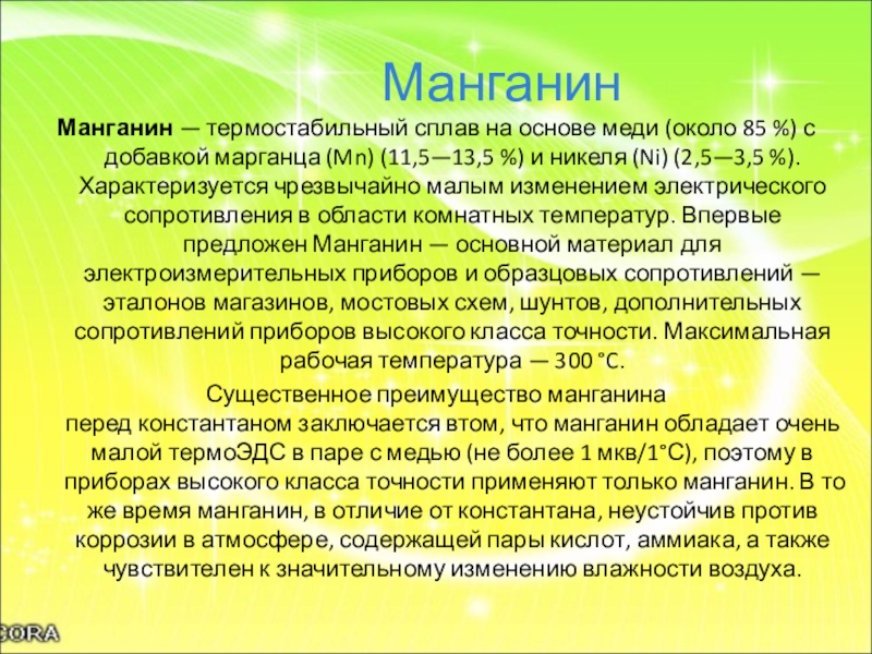 Существенное преимущество манганина перед константаном заключается втом, что манганин обладает очень малой термоЭДС в паре с медью (не более 1 мкв/1°С), поэтому в приборах высокого класса точности применяют только манганин. В то же время манганин, в отличие от константана, неустойчив против коррозии в атмосфере, содержащей пары кислот, аммиака, а также чувствителен к значительному изменению влажности воздуха.