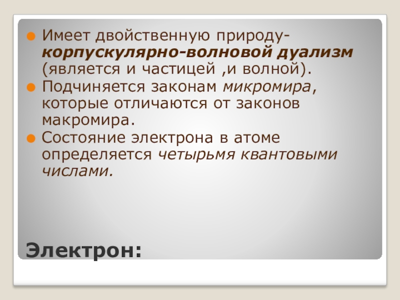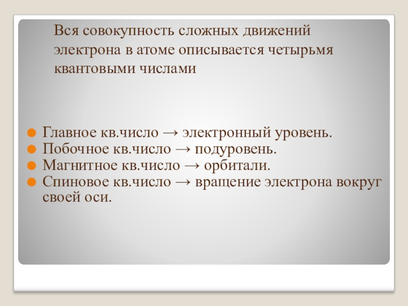 Вся совокупность сложных движений электрона в атоме описывается четырьмя квантовыми числами