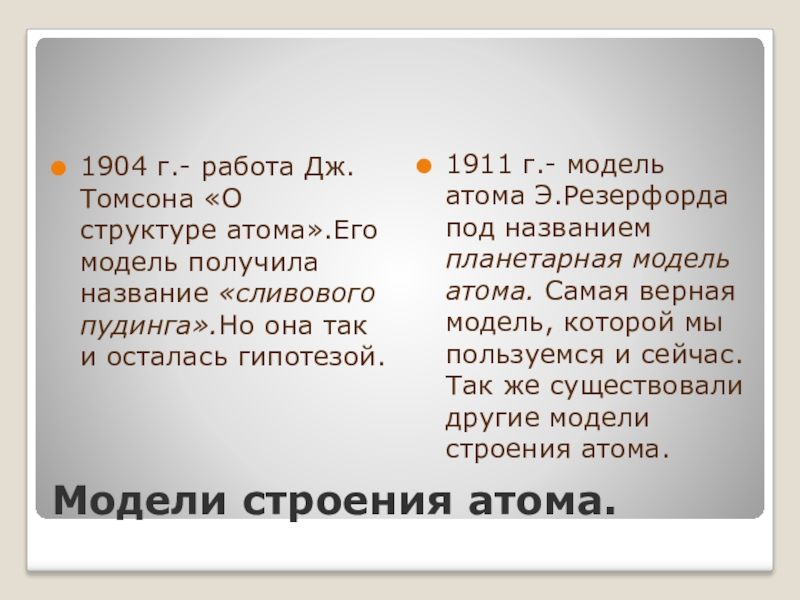 1911 г.- модель атома Э.Резерфорда под названием планетарная модель атома. Самая верная модель, которой мы пользуемся и сейчас. Так же существовали другие модели строения атома.