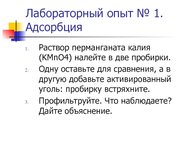 Лабораторный опыт № 1. АдсорбцияРаствор перманганата калия (KMnO4) налейте в две пробирки.Одну оставьте для сравнения, а в