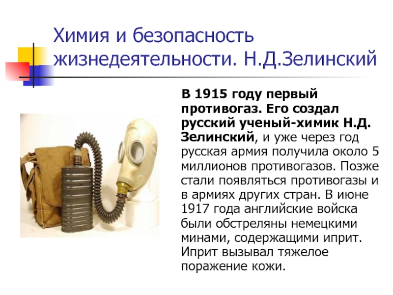 Химия и безопасность жизнедеятельности. Н.Д.Зелинский  В 1915 году первый противогаз. Его создал русский ученый-химик Н.Д. Зелинский,
