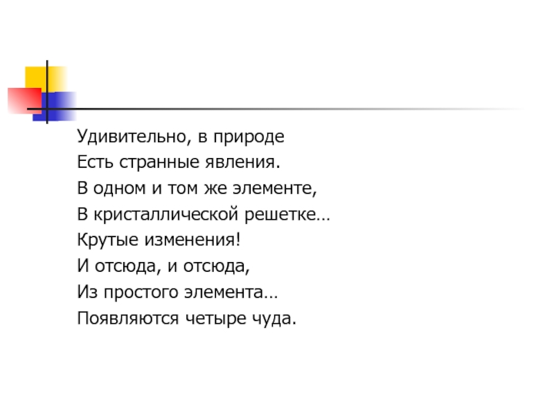 Удивительно, в природеЕсть странные явления.В одном и том же элементе,В кристаллической решетке…Крутые изменения!И отсюда, и отсюда,Из простого