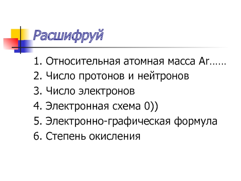 Расшифруй 1. Относительная атомная масса Ar……2. Число протонов и нейтронов3. Число электронов4. Электронная схема 0))5. Электронно-графическая формула6.