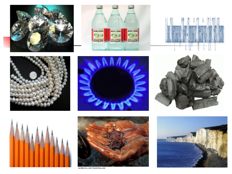 1. Алмаз 2. Минеральная вода 3. Жемчуг 4. Природный газ 5. Древесный уголь 6. Графит 7. Нефть