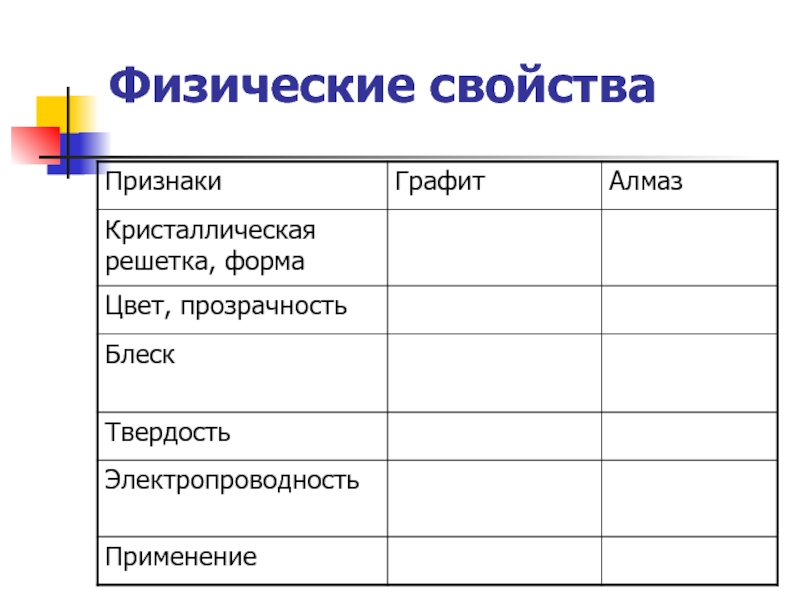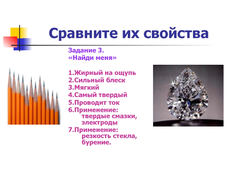 Сравните их свойстваЗадание 3. «Найди меня»1.Жирный на ощупь2.Сильный блеск3.Мягкий4.Самый твердый5.Проводит ток6.Применение: твердые смазки, электроды7.Применение: резкость