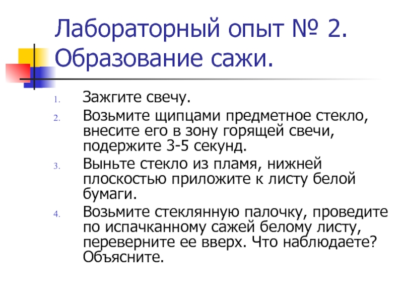 Лабораторный опыт № 2. Образование сажи.Зажгите свечу.Возьмите щипцами предметное стекло, внесите его в зону горящей свечи, подержите