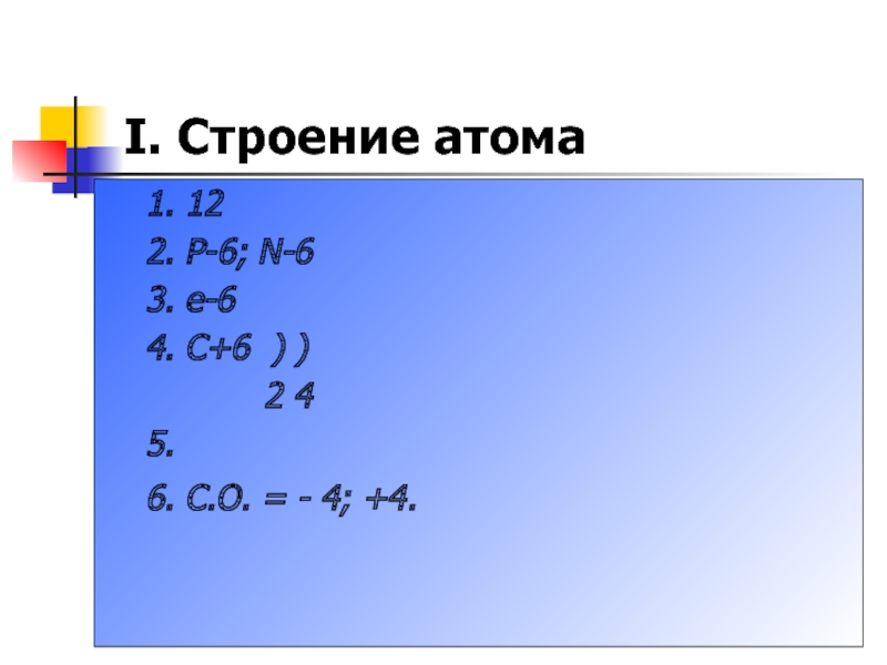 I. Строение атома1. 122. Р-6; N-63. е-64. С+6 ) )      2 45.
