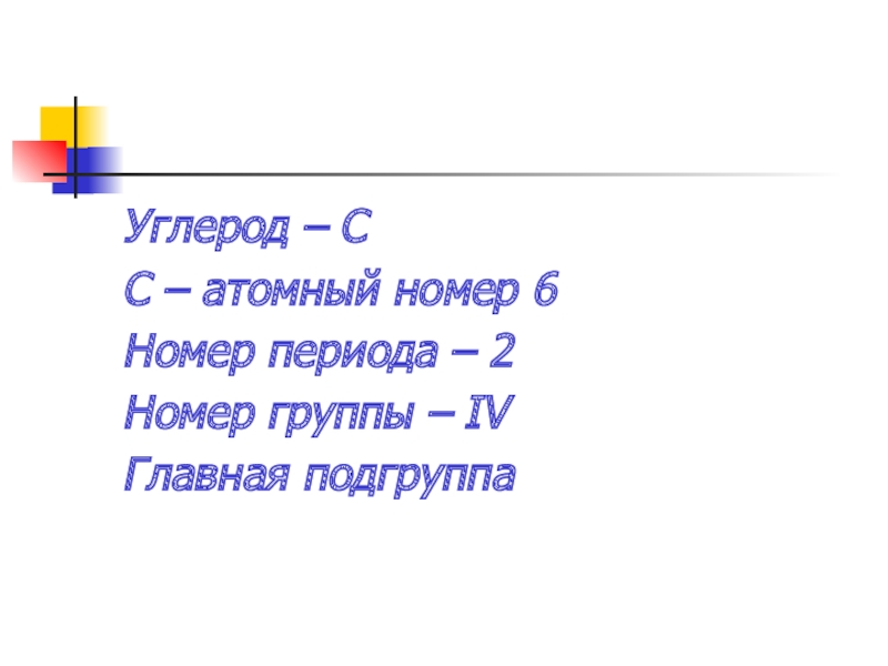 Углерод – СС – атомный номер 6Номер периода – 2Номер группы – IVГлавная подгруппа