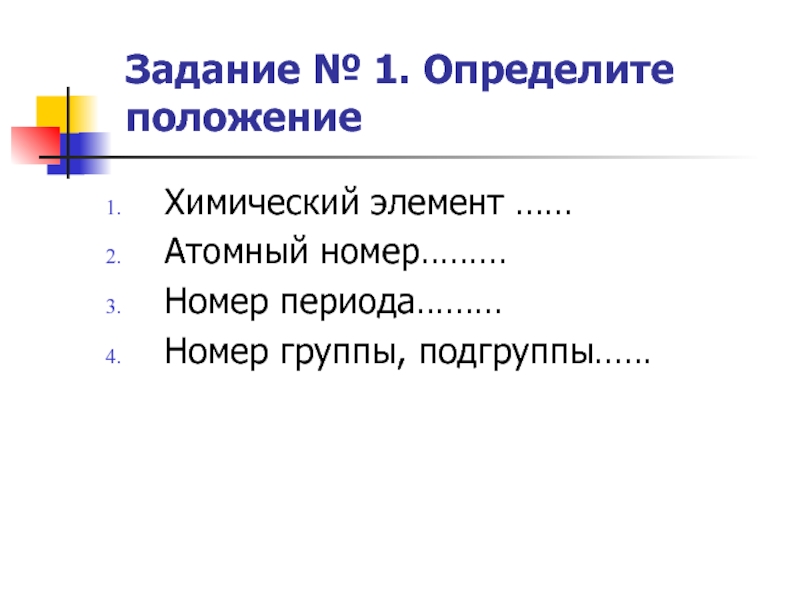 Задание № 1. Определите положениеХимический элемент ……Атомный номер………Номер периода………Номер группы, подгруппы……
