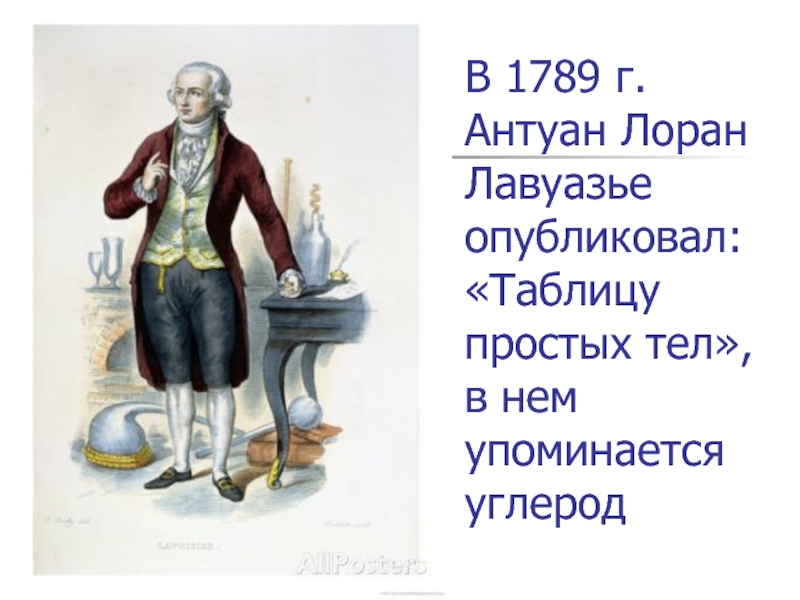 В 1789 г. Антуан Лоран Лавуазье опубликовал: «Таблицу простых тел», в нем упоминается углерод