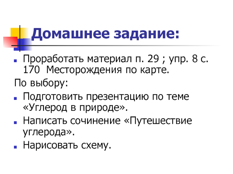 Домашнее задание:Проработать материал п. 29 ; упр. 8 с. 170 Месторождения по карте.По выбору:Подготовить презентацию по теме