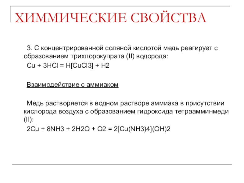 3. С концентрированной соляной кислотой медь реагирует с образованием трихлорокупрата