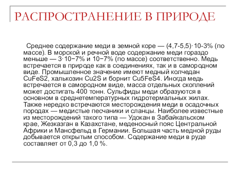 В морской и речной воде содержание меди гораздо меньше — 3·10−7% и 10−7% (по массе) соответственно. Медь встречается в природе как в соединениях, так и в самородном виде. Промышленное значение имеют медный колчедан CuFeS2, халькозин Cu2S и борнит Cu5FeS4. Иногда медь встречается в самородном виде, масса отдельных скоплений может достигать 400 тонн. Сульфиды меди образуются в основном в среднетемпературных гидротермальных жилах. Также нередко встречаются месторождения меди в осадочных породах — медистые песчаники и сланцы. Наиболее известные из месторождений такого типа — Удокан в Забайкальском крае, Жезказган в Казахстане, меденосный пояс Центральной Африки и Мансфельд в Германии. Большая часть медной руды добывается открытым способом. Содержание меди в руде составляет от 0,3 до 1,0 %.