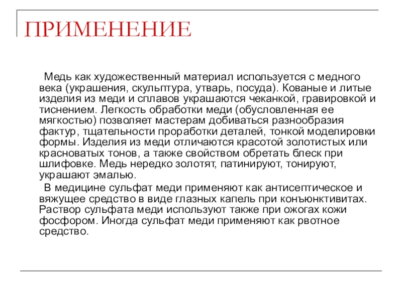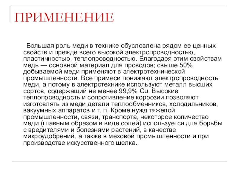 прежде всего высокой электропроводностью, пластичностью, теплопроводностью. Благодаря этим свойствам медь — основной материал для проводов; свыше 50% добываемой меди применяют в электротехнической промышленности. Все примеси понижают электропроводность меди, а потому в электротехнике используют металл высших сортов, содержащий не менее 99,9% Cu. Высокие теплопроводность и сопротивление коррозии позволяют изготовлять из меди детали теплообменников, холодильников, вакуумных аппаратов и т. п. Кроме нужд тяжелой промышленности, связи, транспорта, некоторое количество меди (главным образом в виде солей) используется для борьбы с вредителями и болезнями растений, в качестве микроудобрений, а также в меховой промышленности и при производстве искусственного шелка.