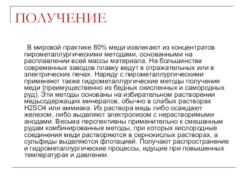 на расплавлении всей массы материала. На большинстве современных заводов плавку ведут в отражательных или в электрических печах. Наряду с пирометаллургическими применяют также гидрометаллургические методы получения меди (преимущественно из бедных окисленных и самородных руд). Эти методы основаны на избирательном растворении медьсодержащих минералов, обычно в слабых растворах H2SO4 или аммиака. Из раствора медь либо осаждают железом, либо выделяют электролизом с нерастворимыми анодами. Весьма перспективны применительно к смешанным рудам комбинированные методы, при которых кислородные соединения меди растворяются в сернокислых растворах, а сульфиды выделяются флотацией. Получают распространение и гидрометаллургические процессы, идущие при повышенных температурах и давлении.