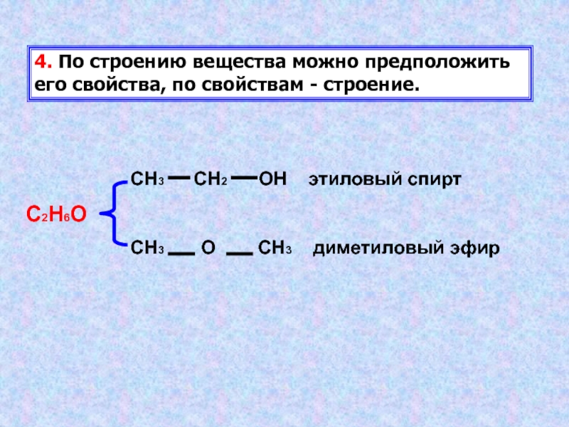 Различные физические и химические свойства соединений, имеющих одинаковую молекулярную формулу (С6Н12О6 – глюкоза, фруктоза; С4Н10О – бутиловый спирт, диэтиловый эфир)