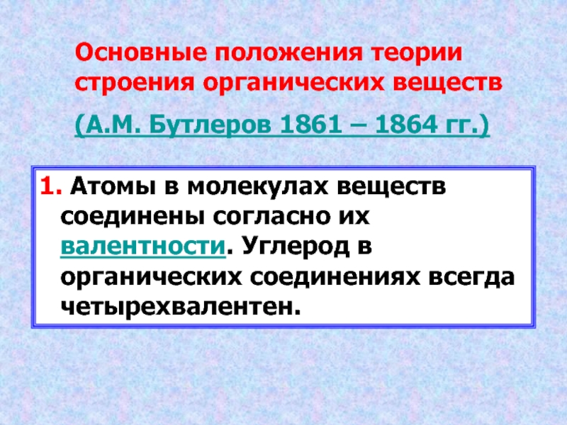 1. Атомы в молекулах веществ соединены согласно их валентности. Углерод в органических соединениях всегда четырехвалентен.