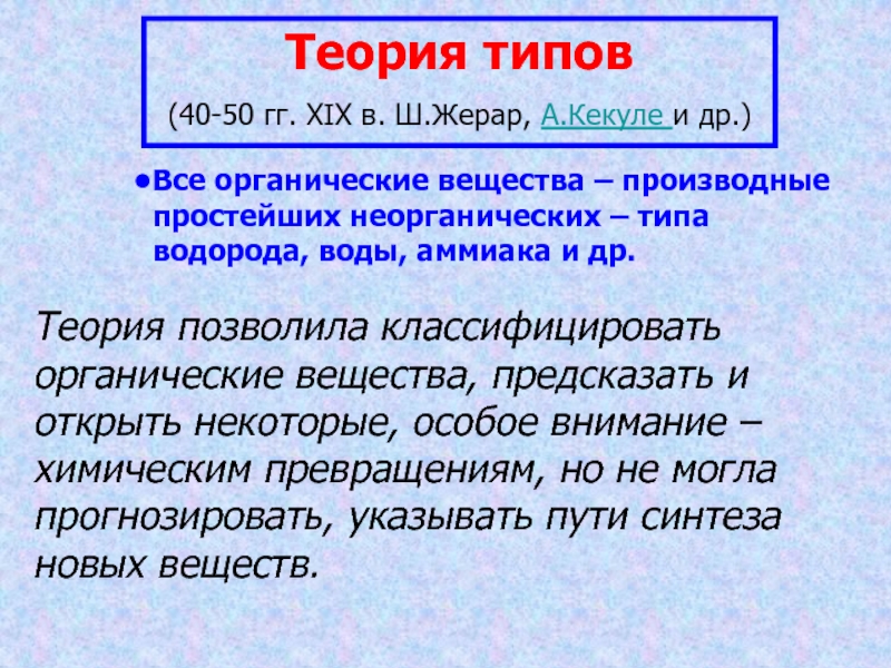 Теория позволила классифицировать органические вещества, предсказать и открыть некоторые, особое внимание – химическим превращениям, но не могла прогнозировать, указывать пути синтеза новых веществ.