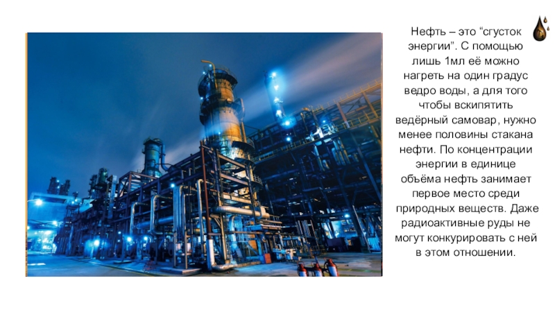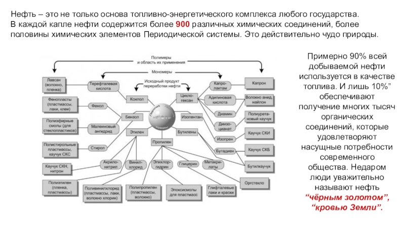 Примерно 90% всей добываемой нефти используется в качестве топлива. И лишь 10%” обеспечивают получение многих тысяч органических соединений, которые удовлетворяют насущные потребности современного общества. Недаром люди уважительно называют нефть “чёрным золотом”, “кровью Земли”.