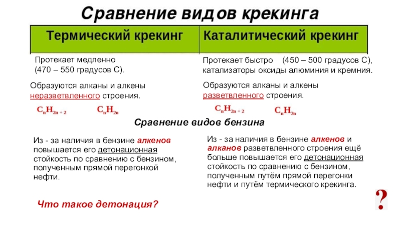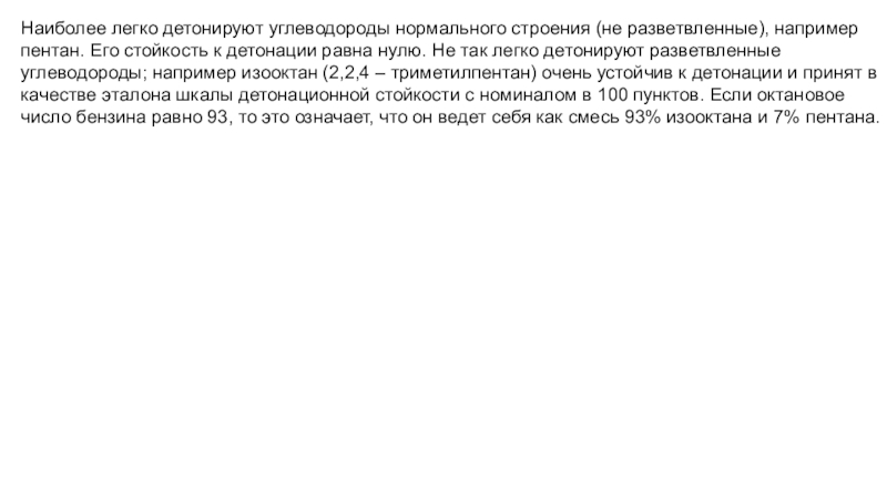 Из - за наличия в бензине алкенов и алканов разветвленного строения ещё больше повышается его детонационная стойкость по сравнению с бензином, полученным путём прямой перегонки нефти и путём термического крекинга.