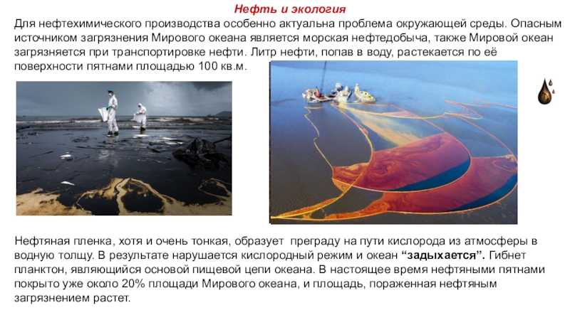Нефтяная пленка, хотя и очень тонкая, образует преграду на пути кислорода из атмосферы в водную толщу. В результате нарушается кислородный режим и океан “задыхается”. Гибнет планктон, являющийся основой пищевой цепи океана. В настоящее время нефтяными пятнами покрыто уже около 20% площади Мирового океана, и площадь, пораженная нефтяным загрязнением растет.