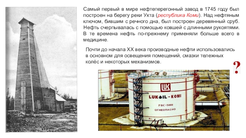 Почти до начала XX века производные нефти использовались в основном для освещения помещений, смазки тележных колёс и некоторых механизмов.
